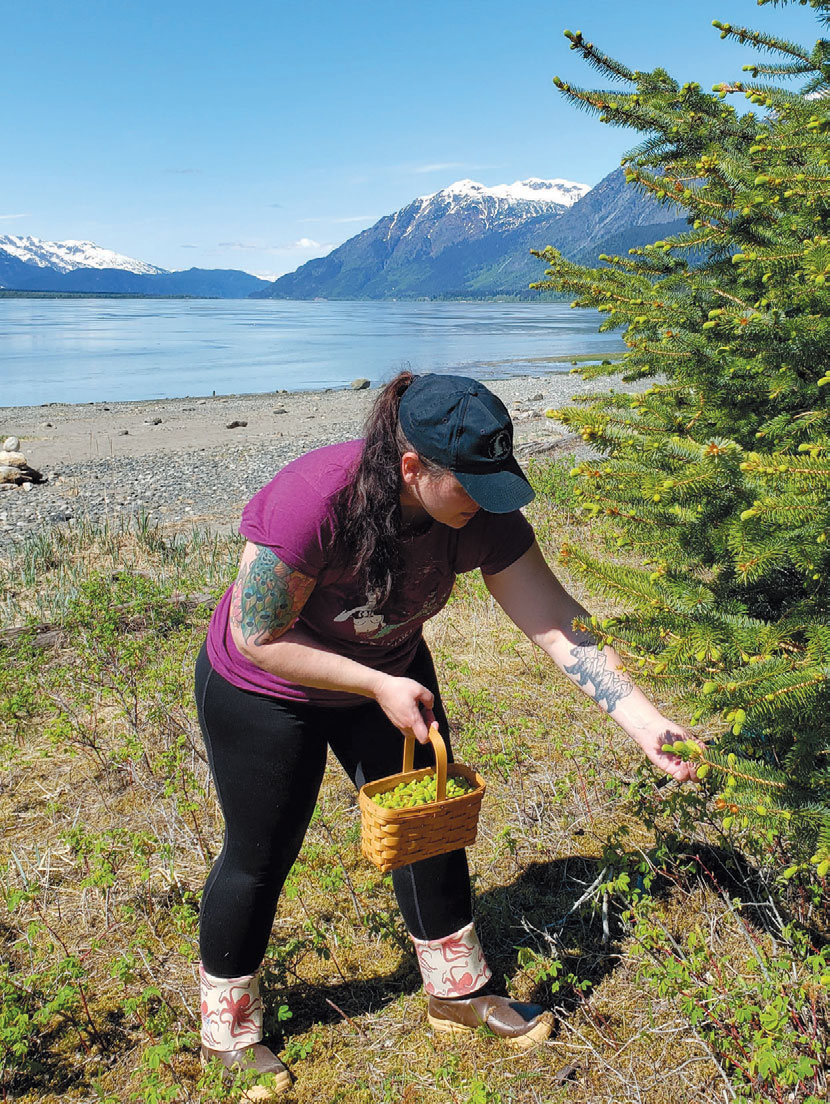 One of the most ubiquitous ingredients in local booze is spruce tips, a key ingredient in Port Chilkoot Distillery’s award-winning 50 Fathoms Gin. The owner, Heather Shade, explained that staff and friends harvest the spruce tips—fresh growth from Alaska’s ubiquitous evergreen—every spring in Haines, where the distillery is located. The tips give the gin a unique, but still balanced, local flavor.