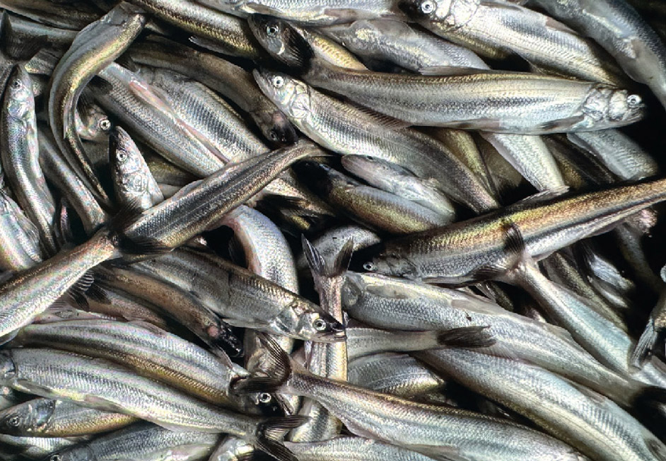Saak is a small fish in the smelt family and measures 4 to 8 inches in length with shimmering silver and blue scales. Fish of different sizes and ages all swim together. When a run is strong, the water can be so packed with fish that it appears black.