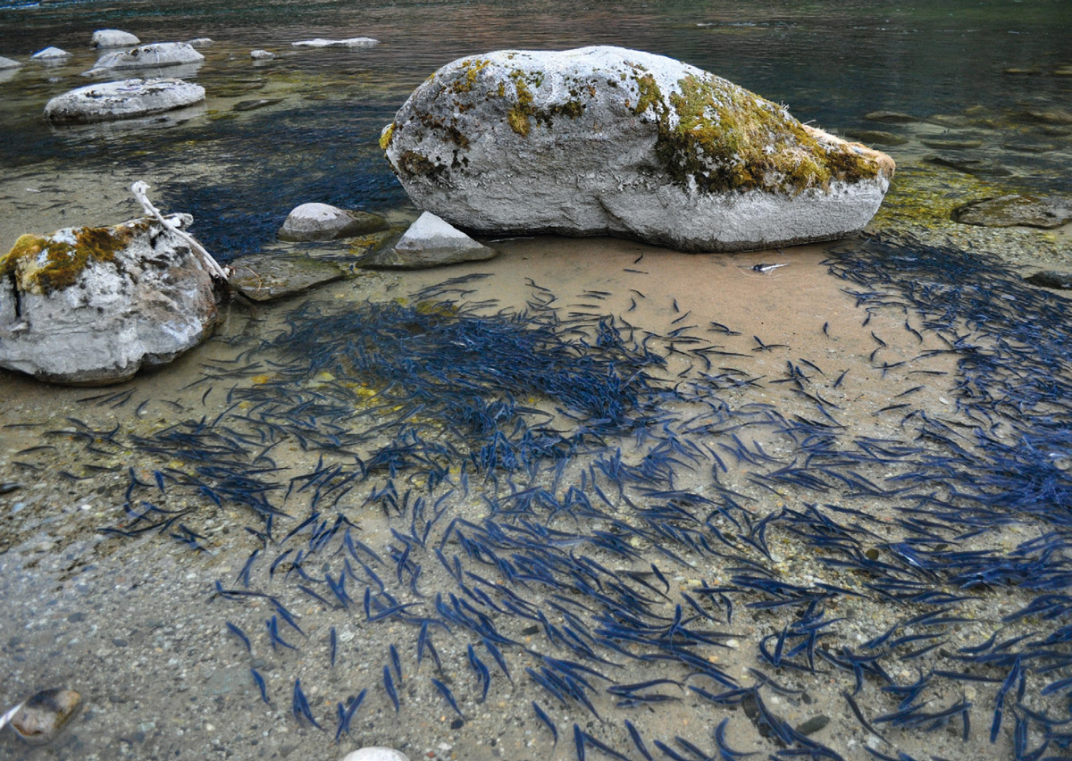 Known as eulachon by biologists, the scientific name is Thaleichthys pacificus. While they once ranged from the coast of northern California to Southwest Alaska, the distinct southern populations in Washington, Oregon, California, and parts of British Columbia have dwindled so much that the runs are classified as threatened, endangered, or even extinct. Eulachon runs in other parts of Southeast Alaska have also declined. The river systems of upper Lynn Canal are among the few in North America still strong enough to support subsistence fishing.
