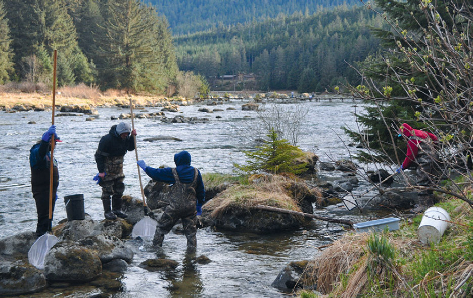 CIA’s partners include Takshanuk Watershed Council (TWC), Skagway Traditional Council (STC), and Oregon State University (OSU). A strength of the program is the partnership between tribal members, elders, scientists, and field technicians who work together in a way that values Indigenous science and traditional ecological knowledge alongside Western science. These baseline population estimates over time will increase understanding of abundance and help guide stewardship and protection of this keystone species that supports the valley’s rich biodiversity and cultural heritage. The program has also inspired other Alaska Native and First Nations communities to start similar eulachon population monitoring studies.