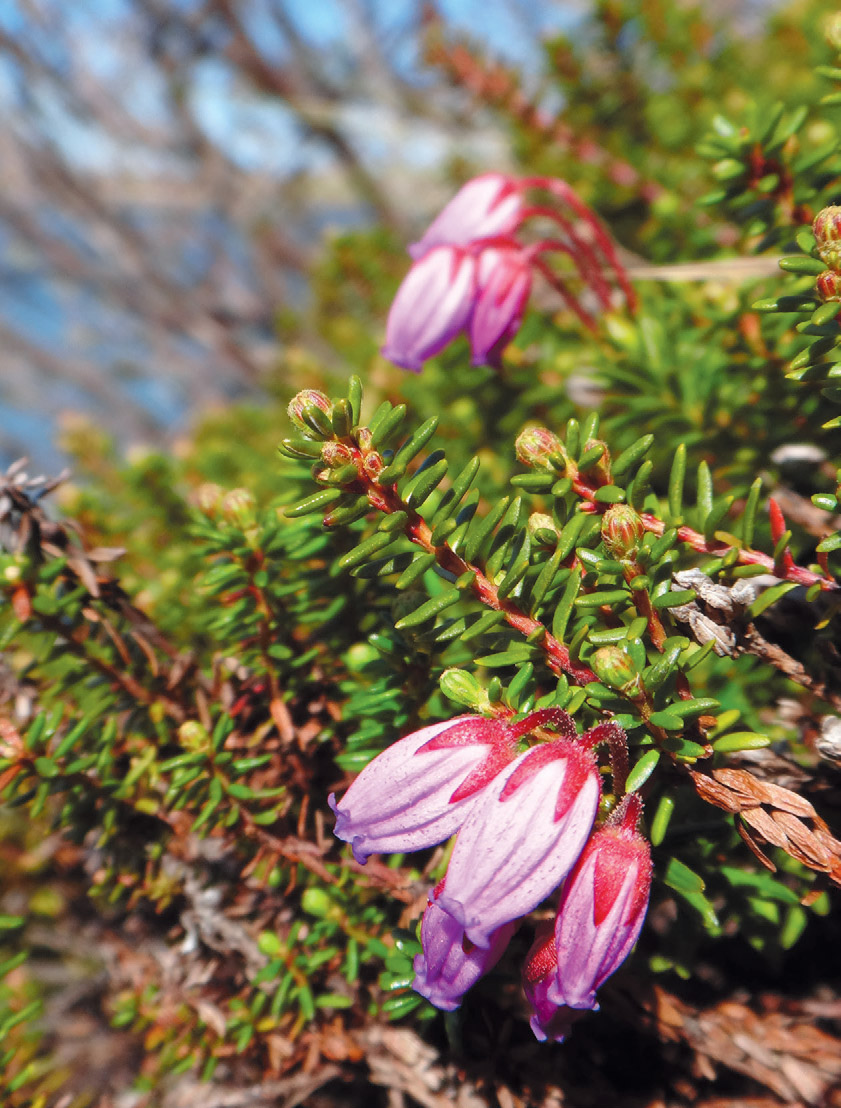 Since then, I have regularly encountered crowberries all over the state, around the villages of the Lower Yukon River to the tundra bluffs of the Northwest Arctic, in the Arctic alpine of the Brooks Range, next to glaciers of Wrangell-St Elias national park, and in the bogs of Southeast Alaska. One spring, I found pretty pink bells flowering by the Bering Sea. For the longest time, I thought these were crowberry flowers, but I recently learned that this plant is called Phyllodoce caerulea, sometimes known as purple mountain heather or blue heath. While this plant is in the same family as crowberry (Ericacea, or heather family), crowberry’s actual flowers are tiny, magenta-colored sprays atop the bright green needles. Another time at the top of one of the domes near Fairbanks, shiny green berries peeked up from a thick evergreen blanket.