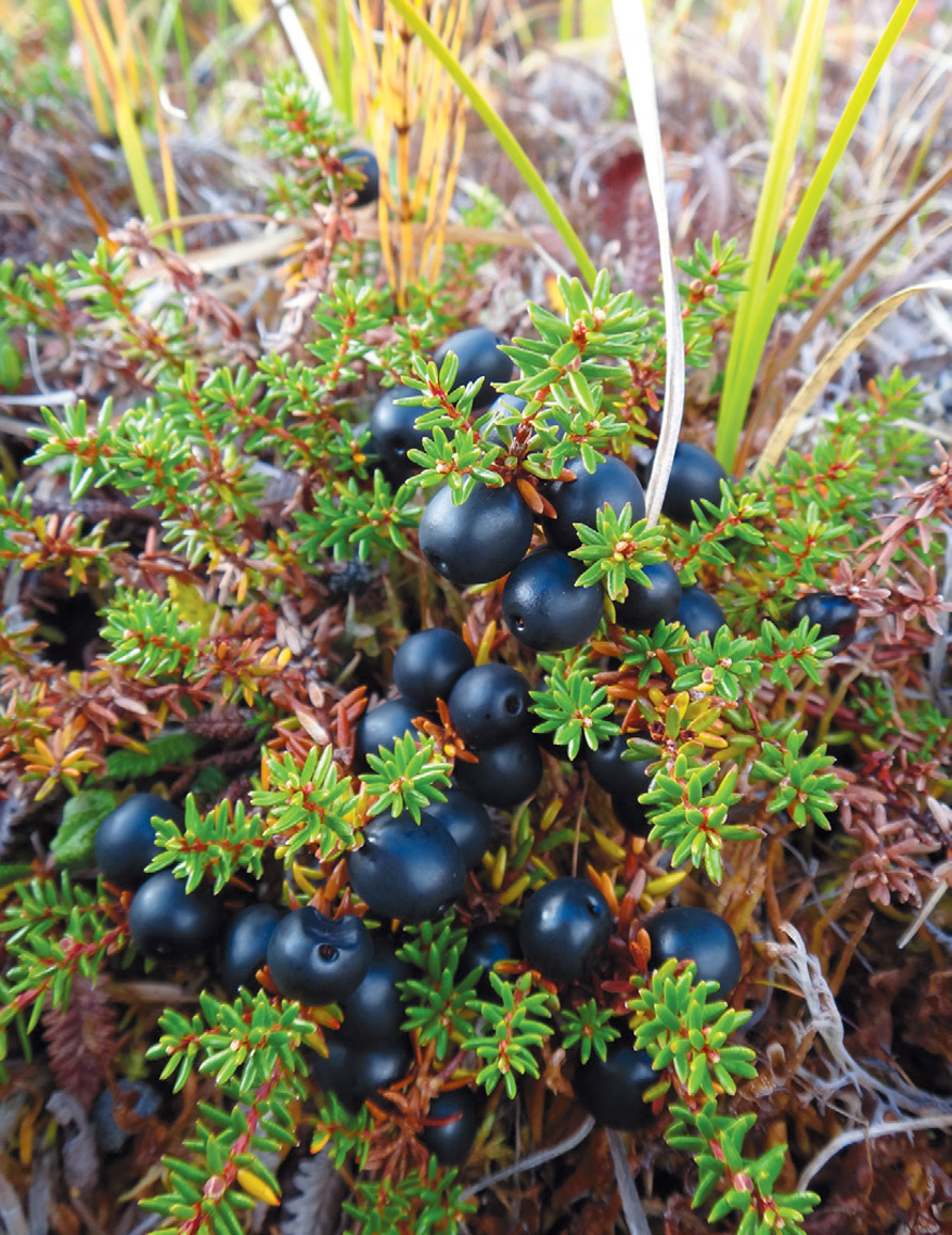 Crowberry is one of Alaska’s most abundant and versatile berries. It is also found all over the circumpolar north in Canada, Scandinavia, Russia, and even parts of Northern Asia. In Alaska, these terrestrial black pearls are also known by their local common names: blackberry, mossberry, kavlakuaraat (Cup’ik), paungat (Inupiaq), paunrat (Yup’ik), and tan’gerpiit (Yup’ik), to name a few. Empetrum nigrum is the Western scientific name, which means en (upon) and petros (rock) in Greek and its distinctive color, nigrum (black), in Latin.
