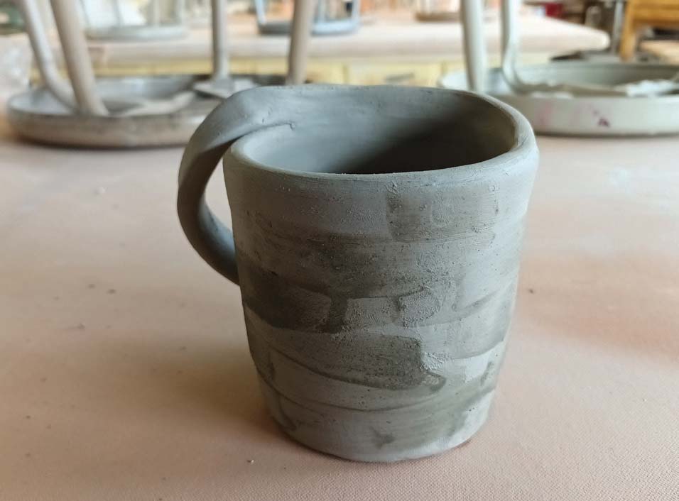 This mug was made with a slip of mineral soils collected near Fairbanks. Some of the soils were used to make pottery, and some to make a decorative slip—a liquefied clay often applied by brush to pottery before it fully dries. Slips can add color and textures unique to the location from which they were harvested. Photo by Kelsey Aho.