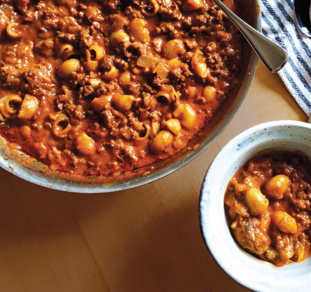 My version calls for a fresh onion (in a pinch, you can sub in onion powder) and a pound of frozen beef, bison, or game. Sometimes I add a ¼ pound more, depending. Instead of macaroni, I like to use small but more substantial pasta shapes like mini penne, shells, or cavatappi. I find these at Costco or in the pretty impressive pasta section at Anchorage Walmart. I like slightly high-quality pasta’s texture and its starch makes the sauce silky. I use broth to deepen the flavor. You could sub in bouillon, but watch the salt. The sharp Cheddar is the only thing that you can’t skip. It’s essential. The grown-ups also usually like a couple splashes of Tabasco in their bowls.